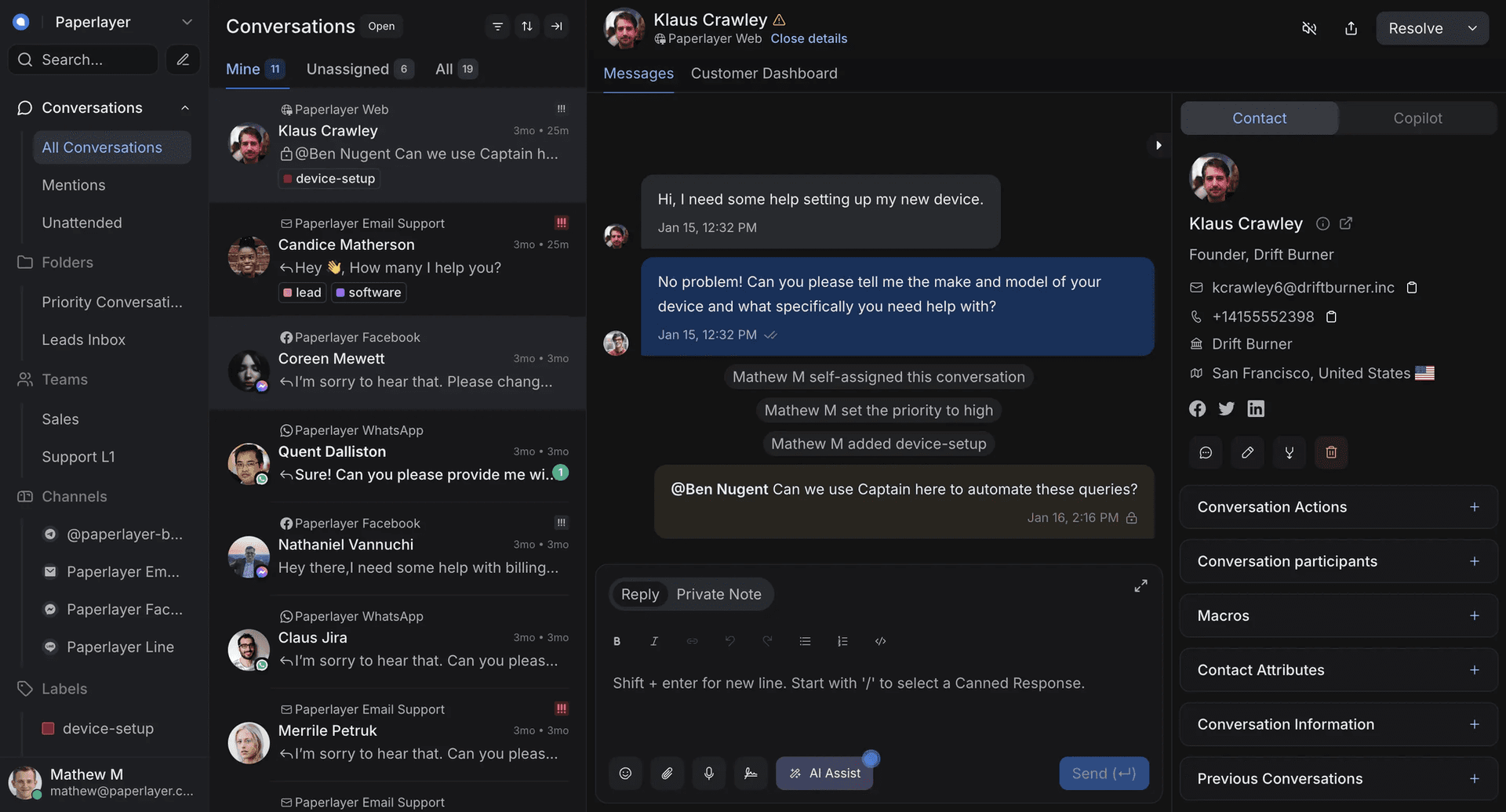 Set up automated routing for technical queries, integrate with development tools like Linear, and maintain comprehensive user interaction histories.