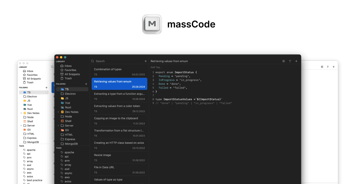 Briefly, massCode offers a polished desktop experience (Windows, macOS, Linux) powered by Electron, Vue 3, and the battle‑tested CodeMirror editor. It mimics the workflow of commercial tools like SnippetsLab or Quiver while staying completely open source, extensible, and cost‑free.
